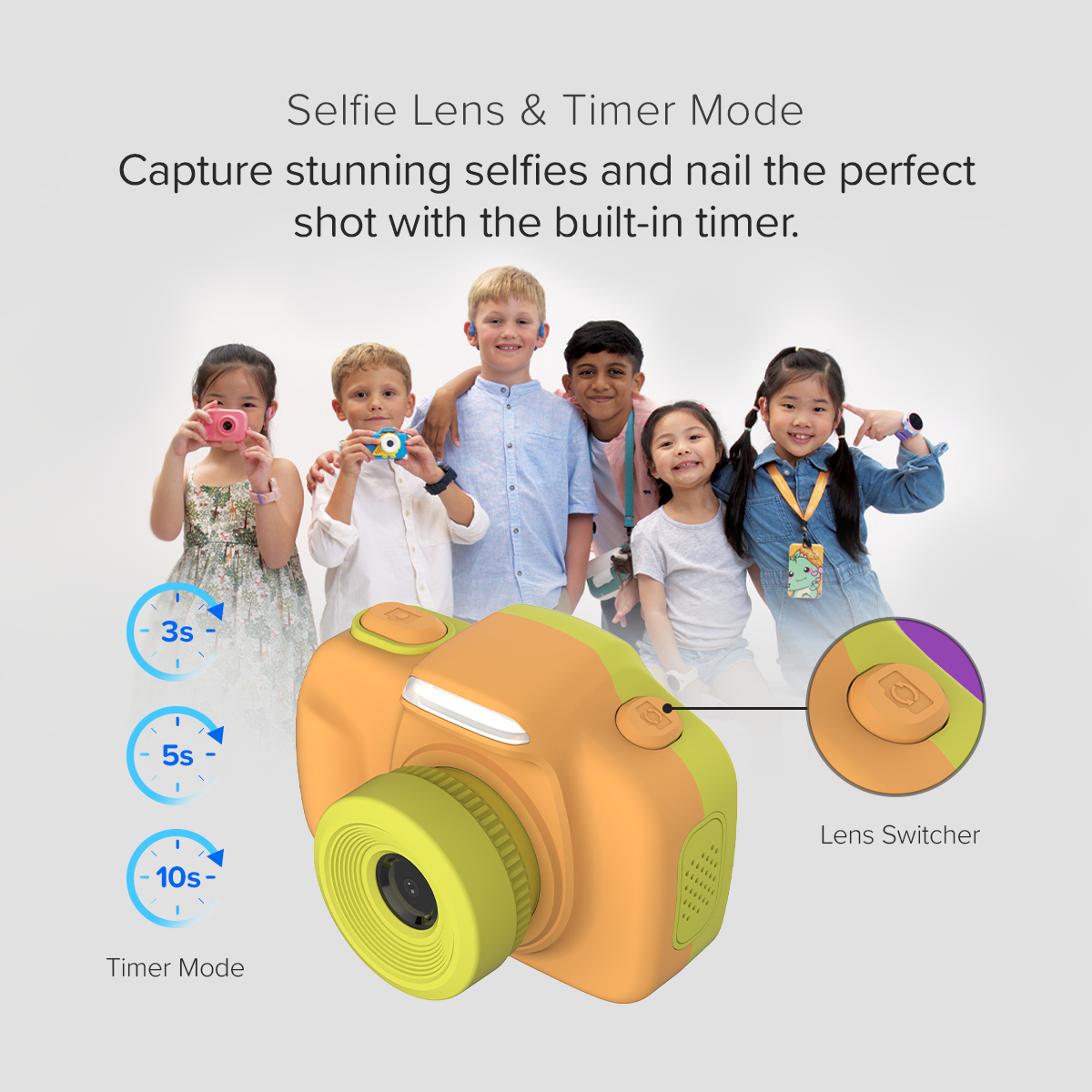 We know how difficult it is to take selfies without dropping your camera. So we’ve added a selfie lens above the screen. With a push of our lens selector button, take selfies with ease. Selfies made easy with myFirst Camera 3.